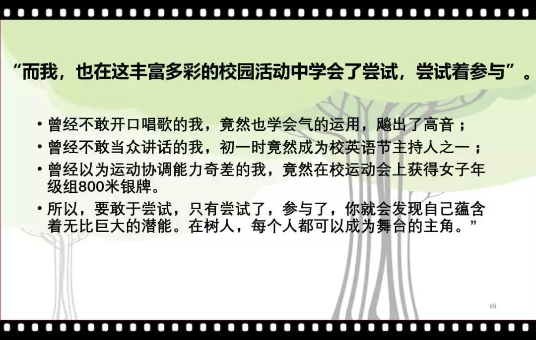 树人拥有丰富的德育课程、前沿性的学科拓展和形式多样的活动,这些既对每一个学子提出了考验,又对他们是前所未有的机遇。一个明智的人总是抓住机遇,把它变成美好的未来。机遇是在纷纭世事之中,许多复杂因子运行之间,偶然凑成一个有利于你的空隙。