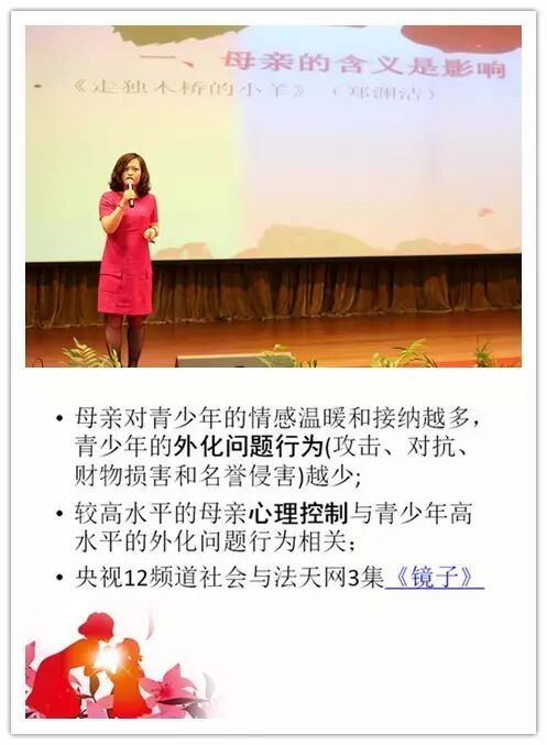 母亲的含义是影响。从《走独木桥的小羊》童话故事的由来和童话大王郑渊洁的经历开始说起,孙小红老师十分认同母亲的含义就是影响,“母亲教育修养的重要性是怎么估计都不会过分的”,因为母亲的一言一行、一举一动都会在潜移默化中影响孩子。也由此郑重提醒在座的妈妈们,母亲对孩子的情感温暖和接纳越多,孩子的外化问题行为就越少,而越多的心理控制,外化问题行为就越多。