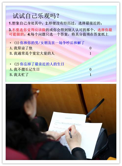 一位好母亲,三代好儿孙。孙小红老师从胡适、冯友兰、鲁迅、茅盾等先生的成长经历中说明,一位母亲的积极情感对孩子的成长影响是巨大的,而商业绩效与积极率追踪研究也证明:无论个人、家庭或组织,能够引发蓬勃发展的积极率是3:1(积极情绪与消极情绪的比例)。这个神奇的3:1大大触动了现场的妈妈们,在随后的自我乐观程度自测中家长们兴致勃勃,积极地认识和了解自己。