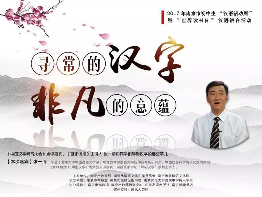 得益于南京市教育局、南京市语言文字工作委员会、南京市鼓楼文化局的前期策划,在南京市教研室、鼓楼区图书馆、南京新华书店等有关单位的协办下,2017年4月24日,教育部语言文字应用研究所研究员、中国社会科学院研究生院教授、《中国汉字听写大会》点评嘉宾、百家讲坛《解码汉字》系列主讲人张一清老师来到我校,作客2017年南京市初中生“汉语活动周”暨“世界读书日”汉语讲台活动,为初一师生带来了一场精彩的汉字探秘之旅。