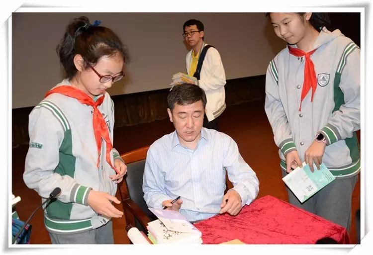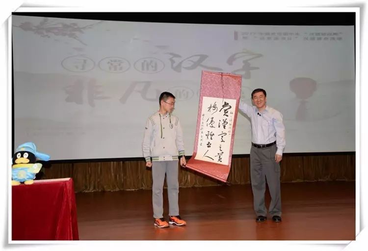 讲座后,初二年级欧阳竟成同学向张老师赠送了题有“赏汉字之美,树优雅之人”的书法作品,邹小飞副校长代表学校向张老师赠送了礼品。散场后,意犹未尽的孩子们围着张老师继续请教,还纷纷请他在其新书《身边汉字•花草字传》上签名留念。