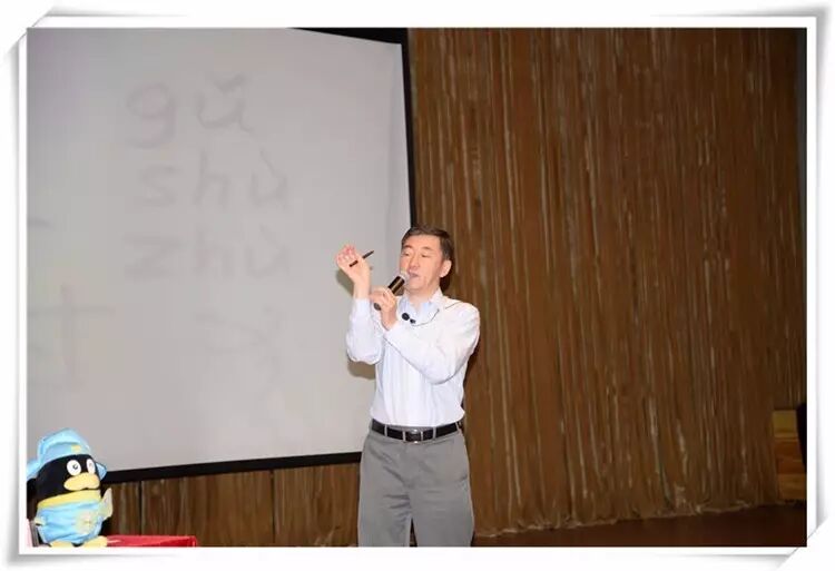 在主持人李真老师的开场白后,张老师以这样亲切的口吻开始了讲座:“孩子们,今天我们就来谈一谈汉语中‘树’和‘人’这两个字……”熟悉而简单的汉字一下子激起了在场师生的热情,孩子们都想知道这两个字的非凡意蕴。张教授将“树”分成三部分,逐一耐心而有趣地进行讲解。他的讲座让大家认识到“树”“从木,尌声”,是“树艺”,也是“种”,小篆为。张教授旁征博引,由“树”拓展到“正直”二字,又由此联系到“人”字,讲到“人”可以构成“大”,并与现场的学生们有趣互动,还情不自禁地背诵起了《道德经》中的“道大,天大,地大,王亦大。域中有四大,而王居其一焉。”张老师睿智、风趣的言语,让学生们认识到每个汉字之所以能成为现在的这种形状,表达着它所代表的那种意义,不是随意赋形赋意的结果,每一笔点画转折之间都是中华文明发展的缩影。